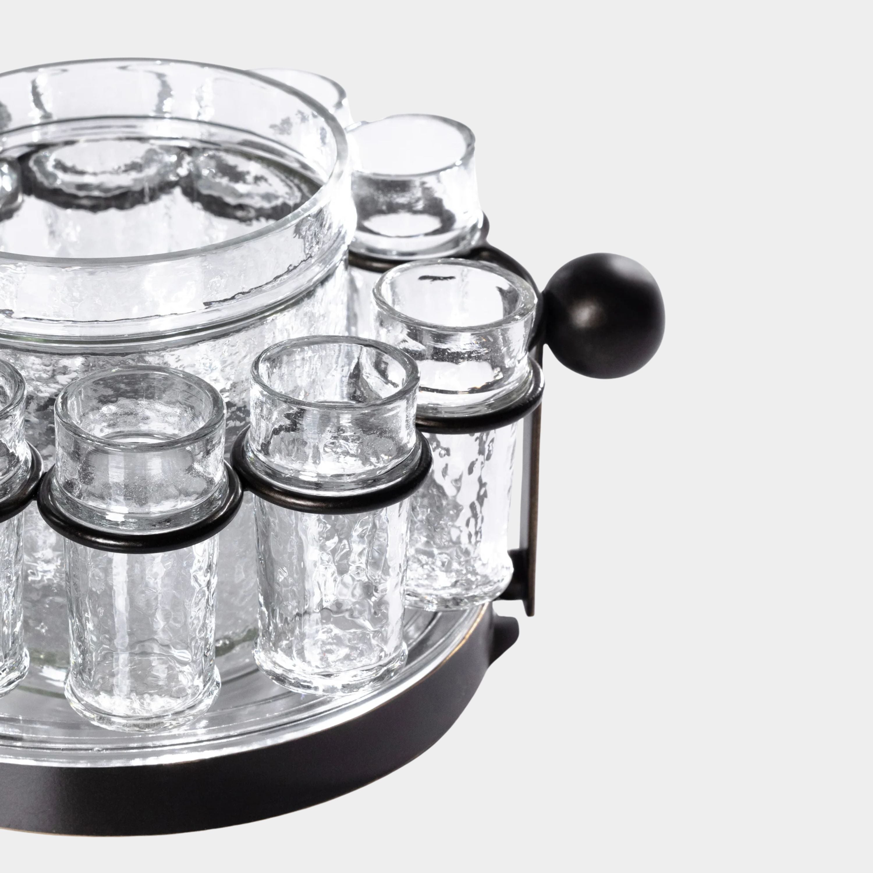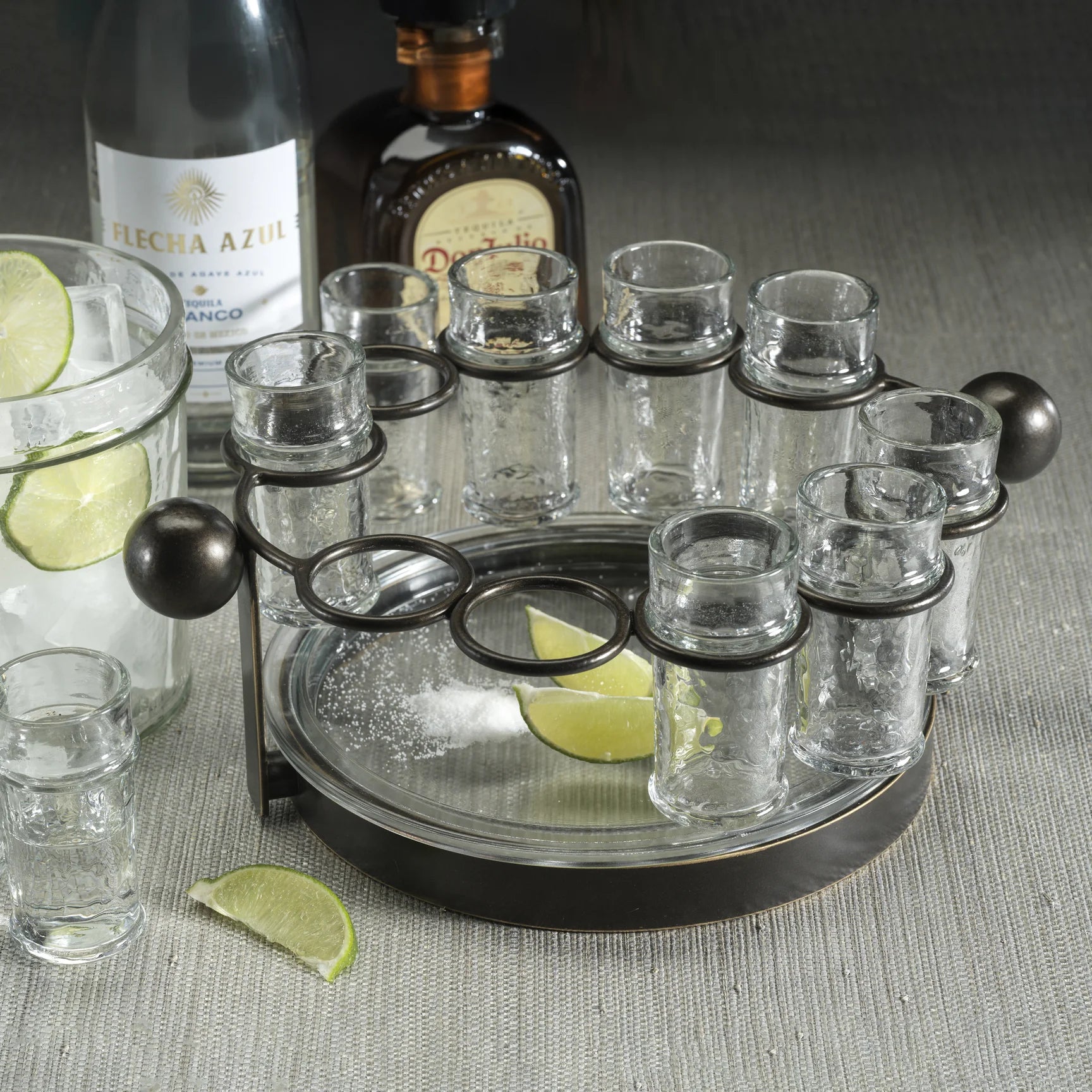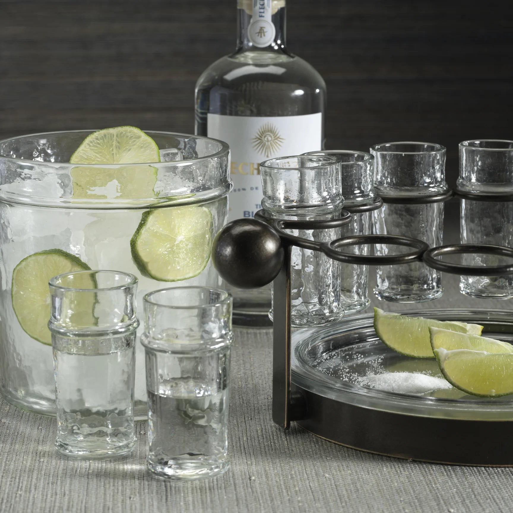 A must-have for tequila enthusiasts, this set includes ten hammered glass shot glasses, a clear hammered glass ice bucket, and a gilded dark bronze-finished iron frame with knob handles. A removable glass plate provides space for salt or citrus wedges, making it a sophisticated way to serve and enjoy tequila.