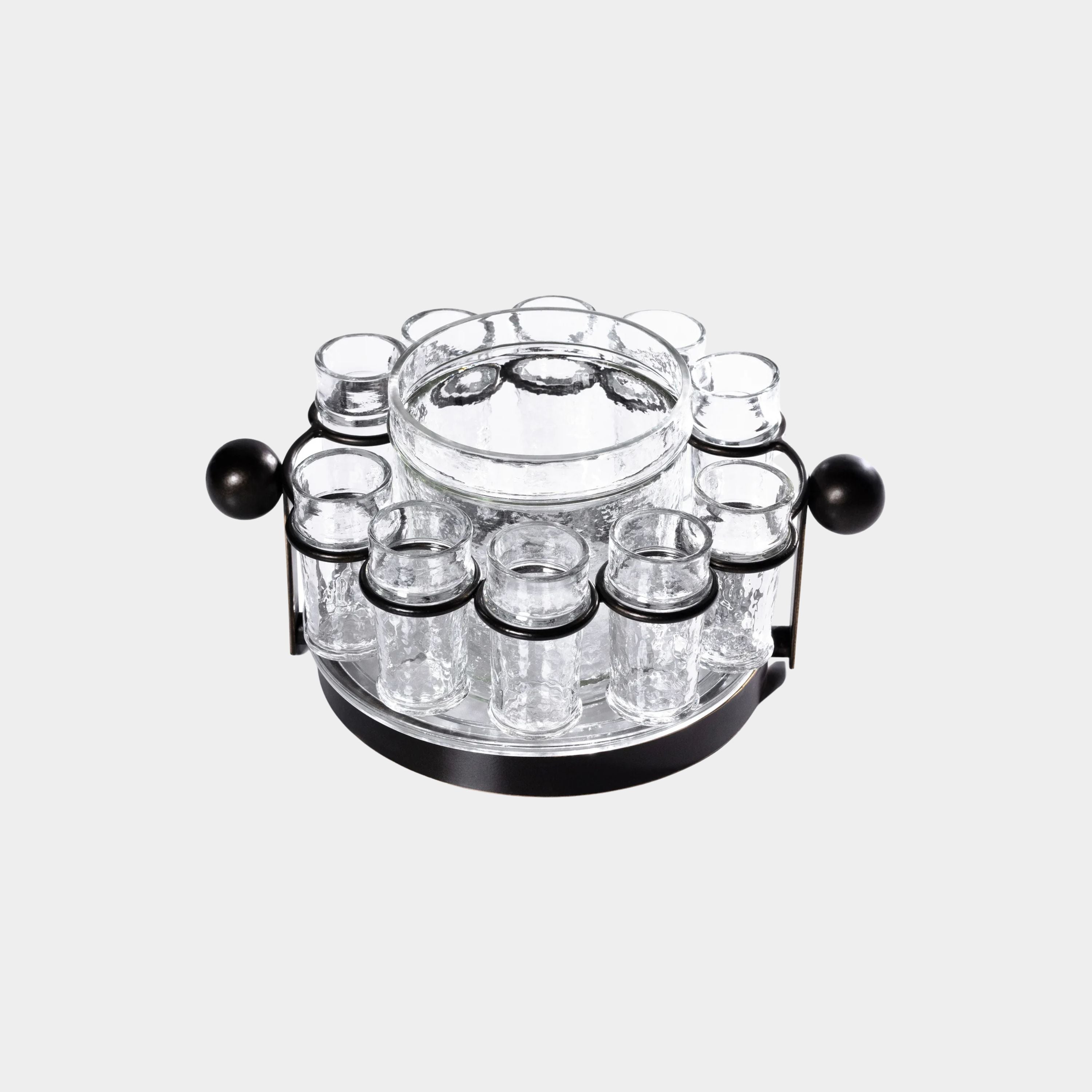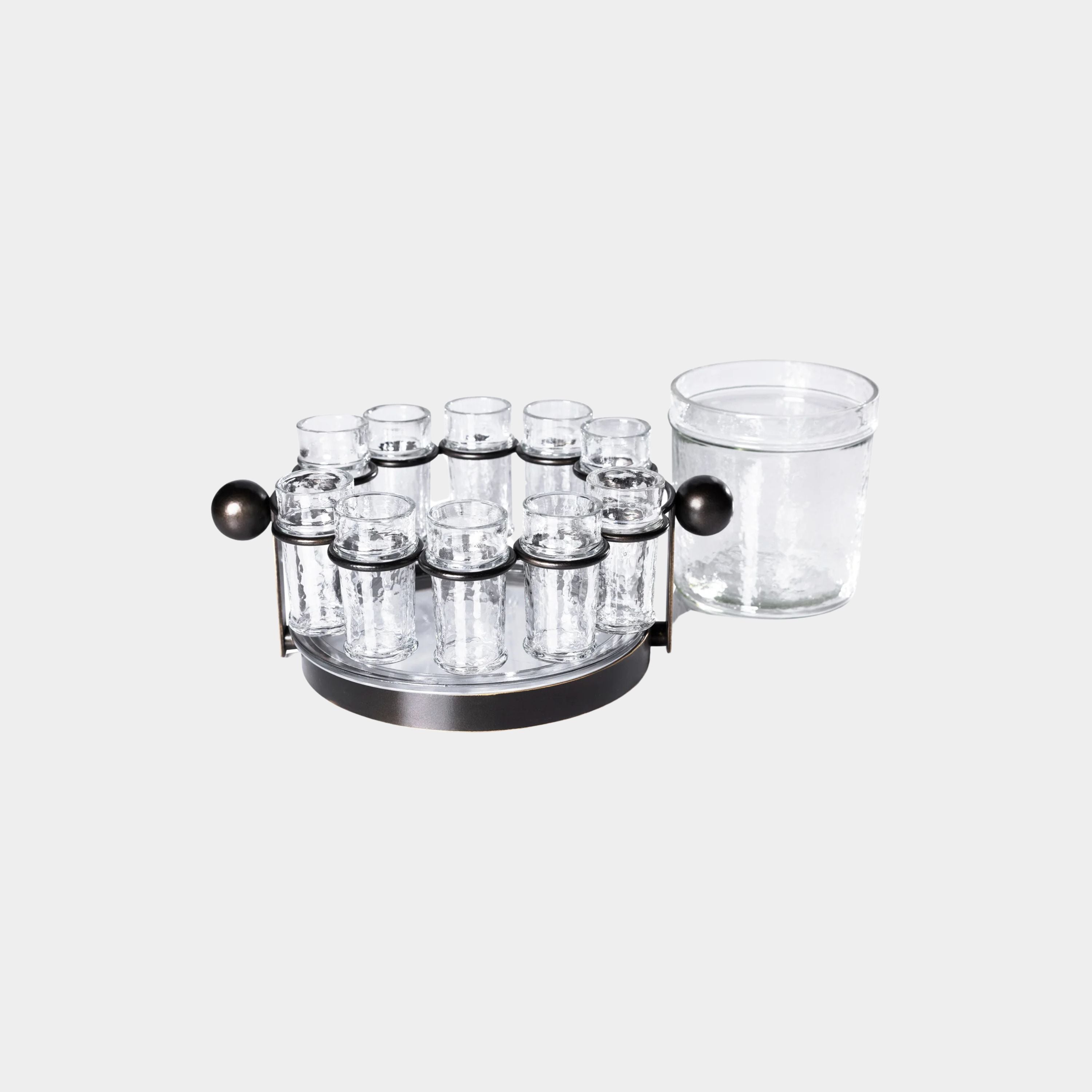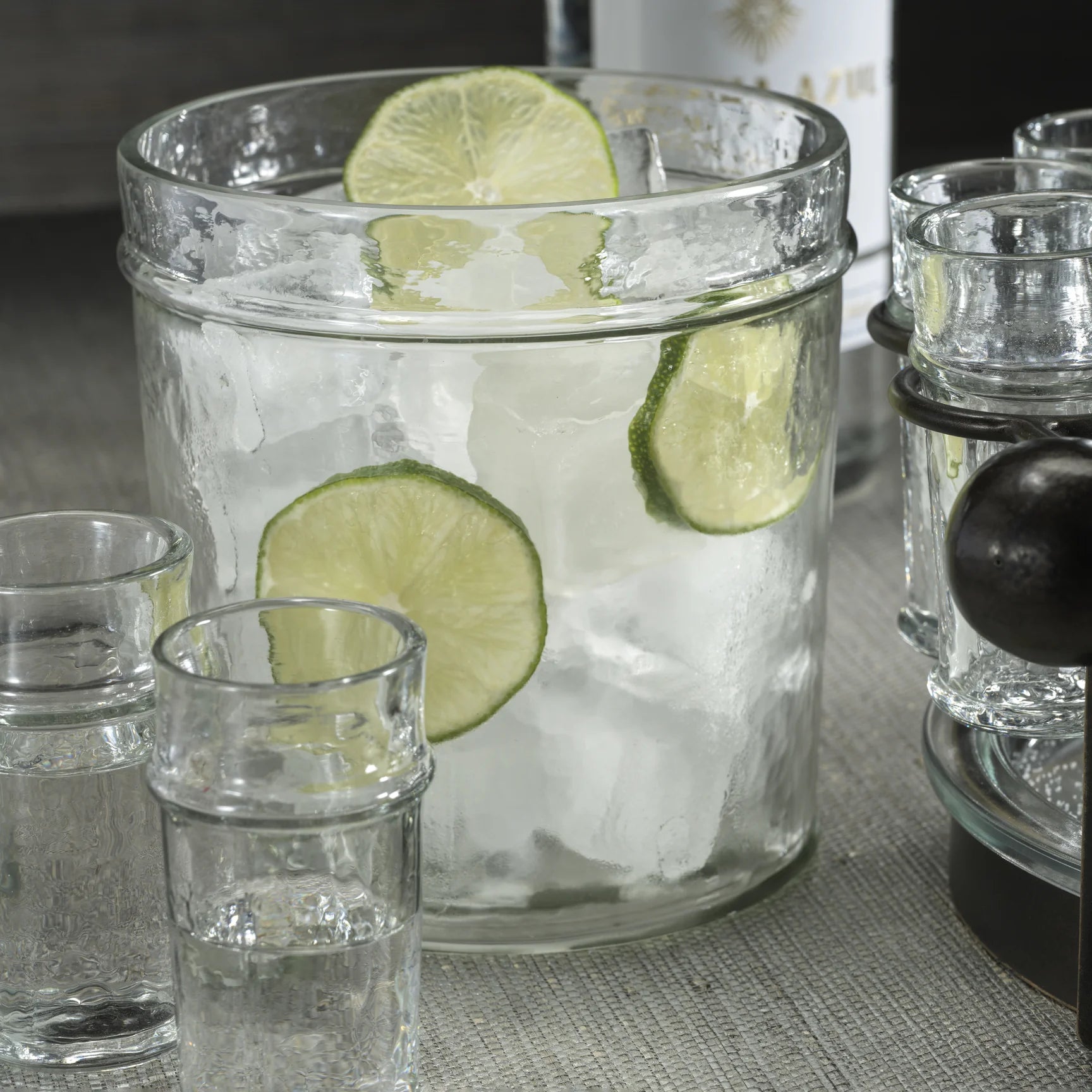 A must-have for tequila enthusiasts, this set includes ten hammered glass shot glasses, a clear hammered glass ice bucket, and a gilded dark bronze-finished iron frame with knob handles. A removable glass plate provides space for salt or citrus wedges, making it a sophisticated way to serve and enjoy tequila.