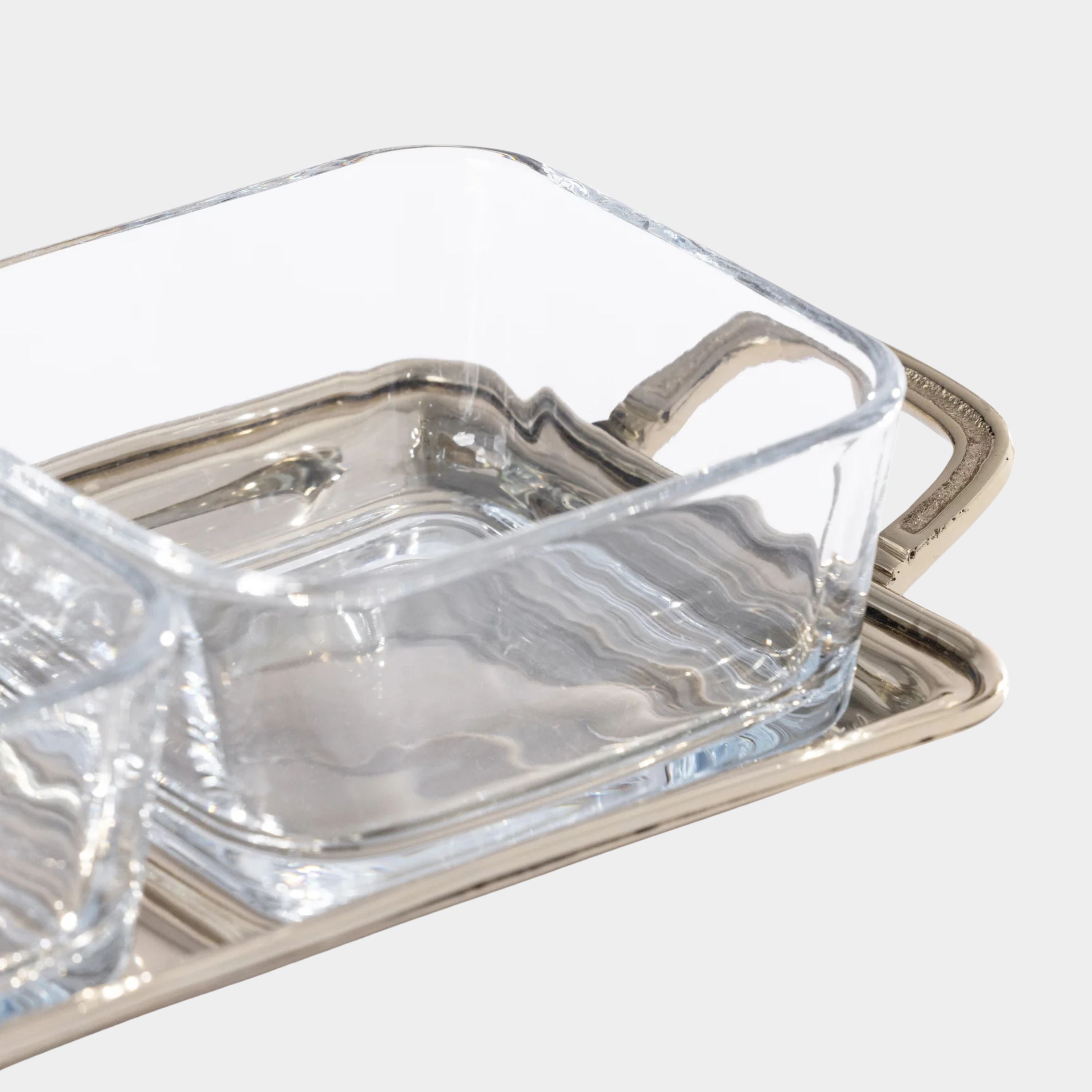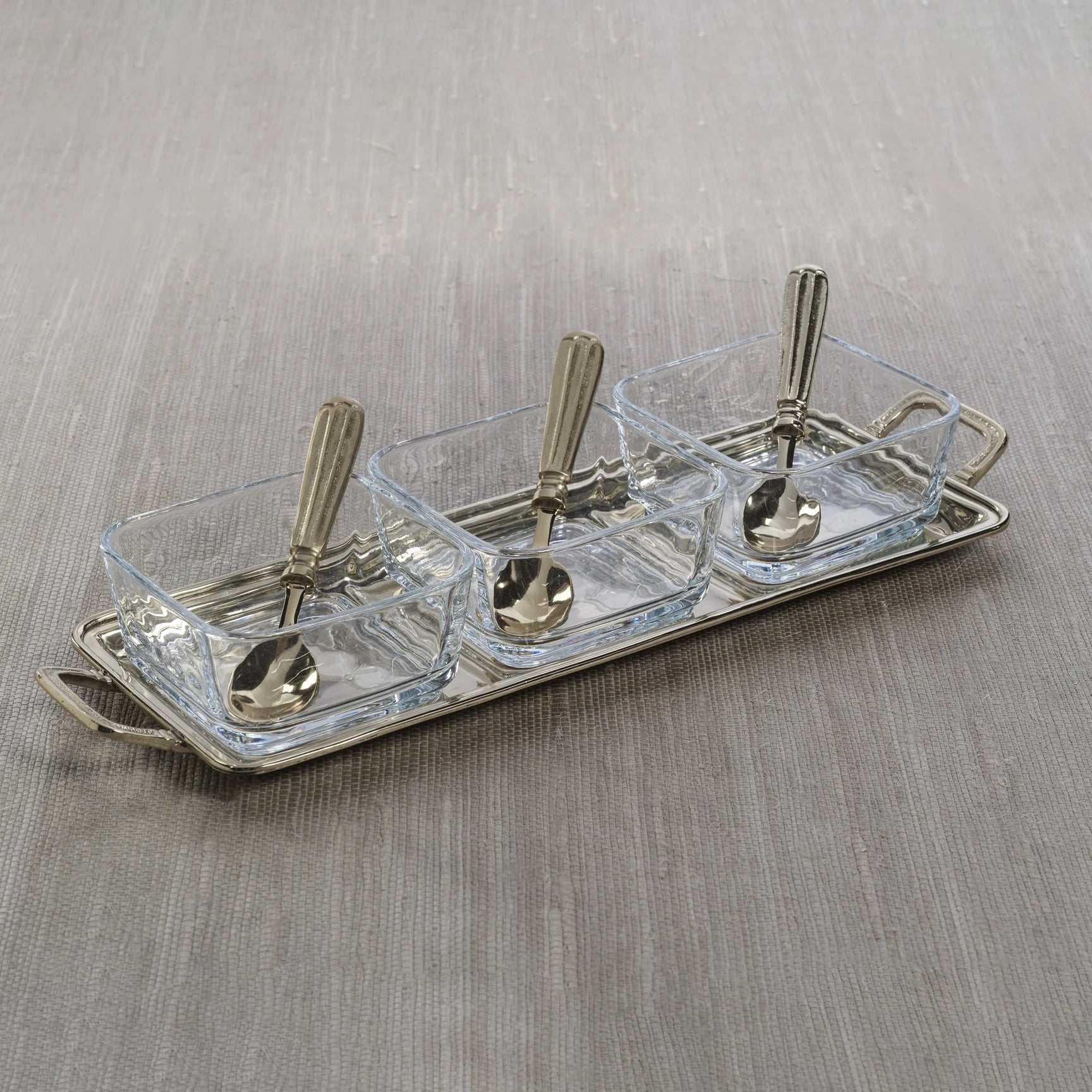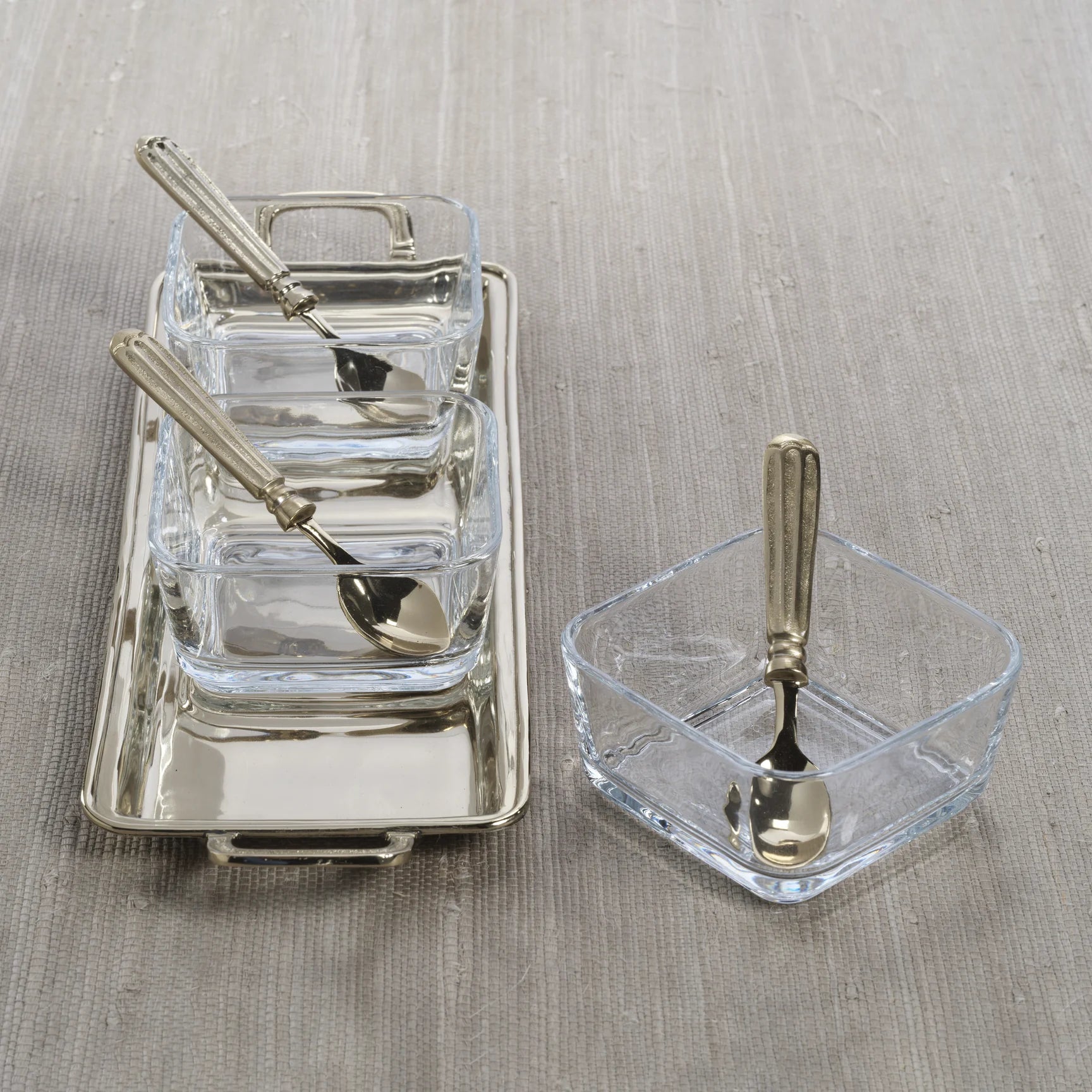 A refined and practical set for entertaining, the Roussillon Condiment Set includes a gold-tone metal tray, three glass bowls, and matching spoons. The polished rectangular tray features convenient side handles, while the clear glass bowls showcase rounded corners for a modern aesthetic. The polished spoons have textured handles for a comfortable grip, making this set a must-have for serving dips, sauces, or garnishes.