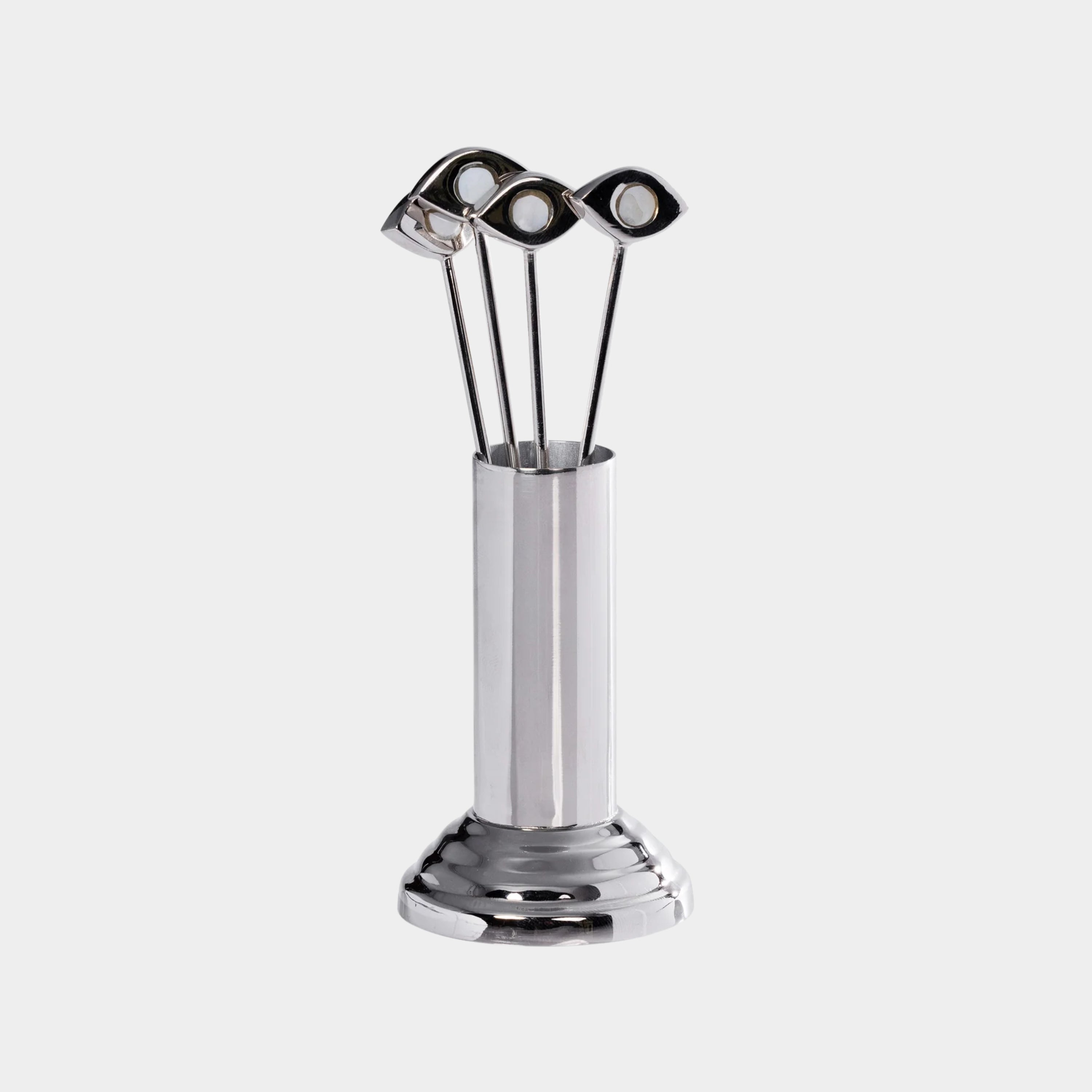 A sculptural take on the everyday cocktail pick. This four-piece set is crafted in polished metal and finished with stylised evil eye finials—long regarded as a symbol of protection. Each pick rests in a weighted cylindrical stand with a stepped base, making an elegant statement on the bar or table. Ideal for garnishes, hors d’oeuvres, or simply as a conversation piece.