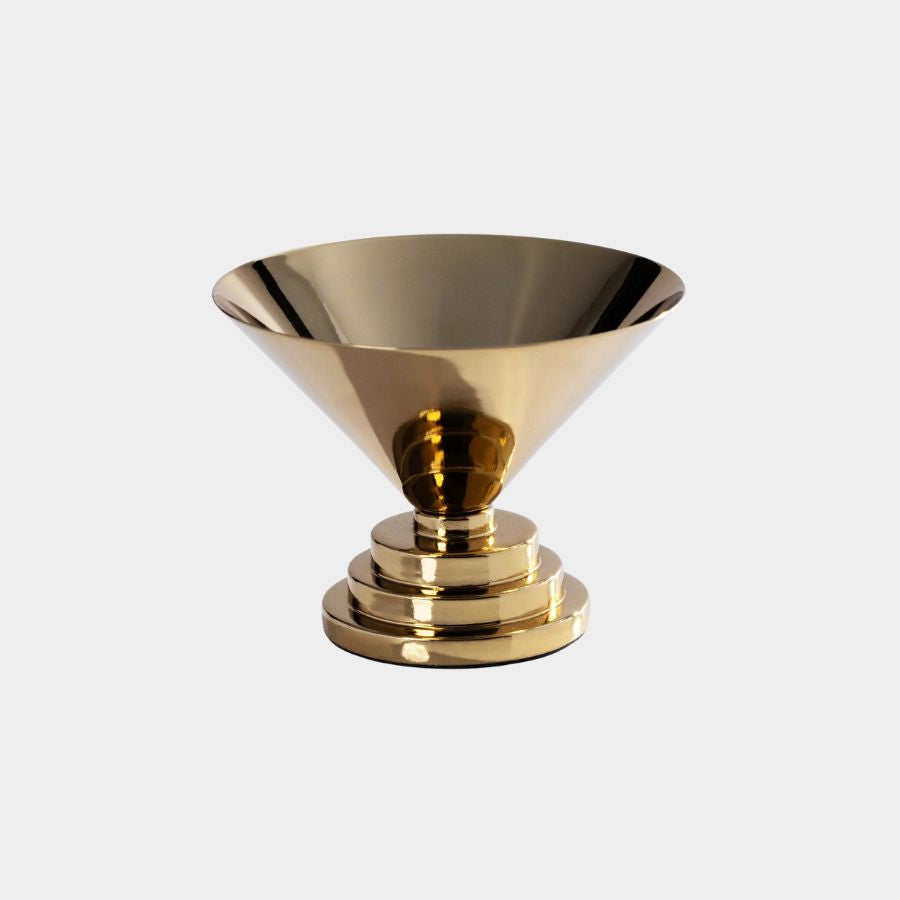 Add sophistication to your table setting with the Mayan Condiment Bowl. Crafted from polished aluminum and stainless steel, this cone-shaped bowl rests on a tiered base that evokes a sense of modern elegance, bringing a touch of contemporary style to any dining experience.