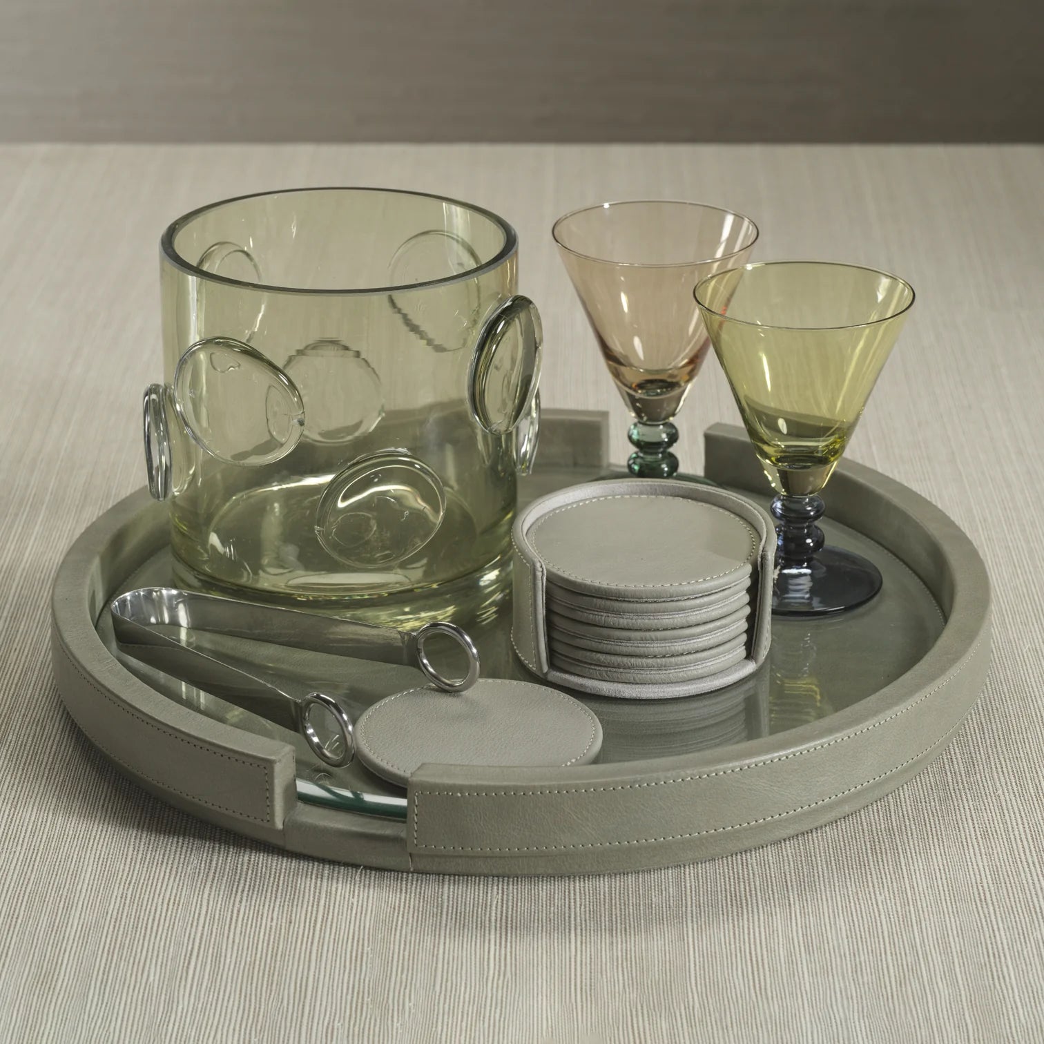 The Leather Coaster Set offers both style and protection for your surfaces. Crafted from premium PDM (Printed Dry Milled) leather, these round coasters feature meticulous detailed stitching for a refined look. The soft suede leather backing ensures a non-slip grip while preventing scratches on delicate surfaces. This set of eight coasters comes with a matching holder, keeping them neatly organized when not in use. Perfect for everyday use or elegant entertaining, these coasters add a sophisticated touch to any table setting.