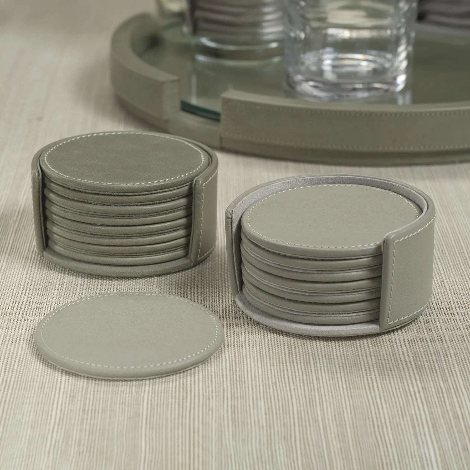 The Leather Coaster Set offers both style and protection for your surfaces. Crafted from premium PDM (Printed Dry Milled) leather, these round coasters feature meticulous detailed stitching for a refined look. The soft suede leather backing ensures a non-slip grip while preventing scratches on delicate surfaces. This set of eight coasters comes with a matching holder, keeping them neatly organized when not in use. Perfect for everyday use or elegant entertaining, these coasters add a sophisticated touch to any table setting.