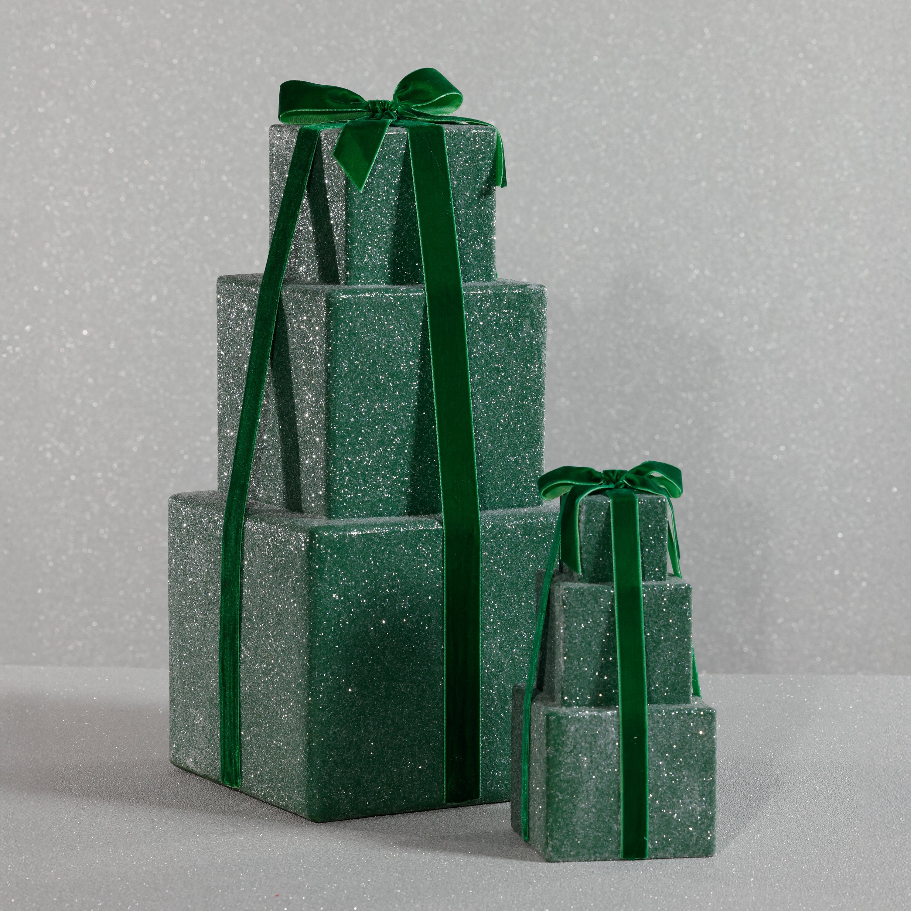 Add a festive accent to your holiday setup with this stacked present figurine. Featuring three gift boxes in a tiered arrangement, each piece is adorned with a soft velvet ribbon and finished with glitter for added sparkle. Whether placed on a mantel, shelf, or tabletop, this cheerful piece brings a playful yet elegant touch to your seasonal display. Available in various classic holiday colors.