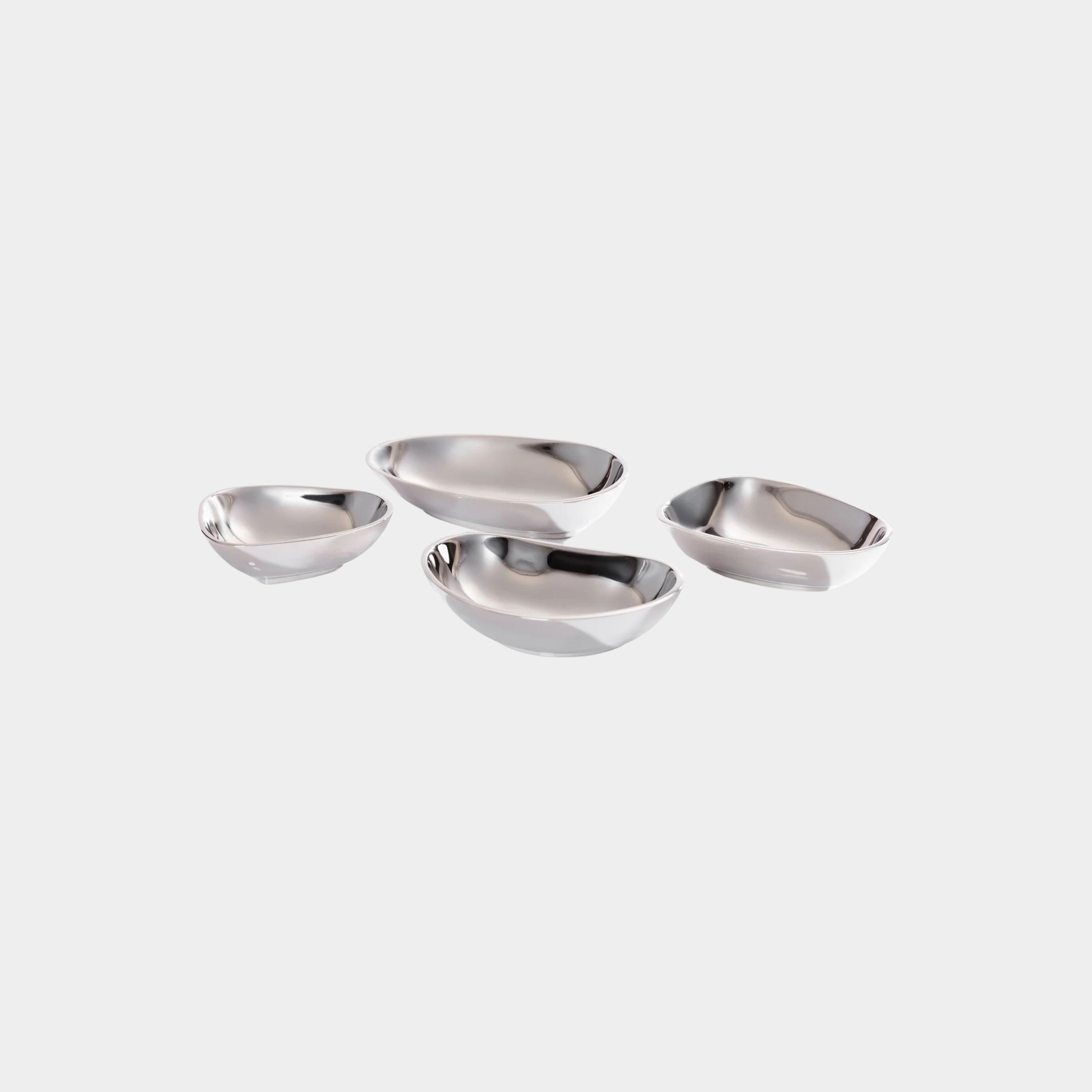 Add a touch of artistry to your table with the Charm Condiment Bowls, a 4-piece set featuring uniquely shaped bowls with a shiny nickel finish. Crafted from lightweight aluminum, each bowl has an organic, free-form design that makes serving sauces, nuts, or dips a stylish experience. This eclectic set effortlessly elevates your dining presentation.