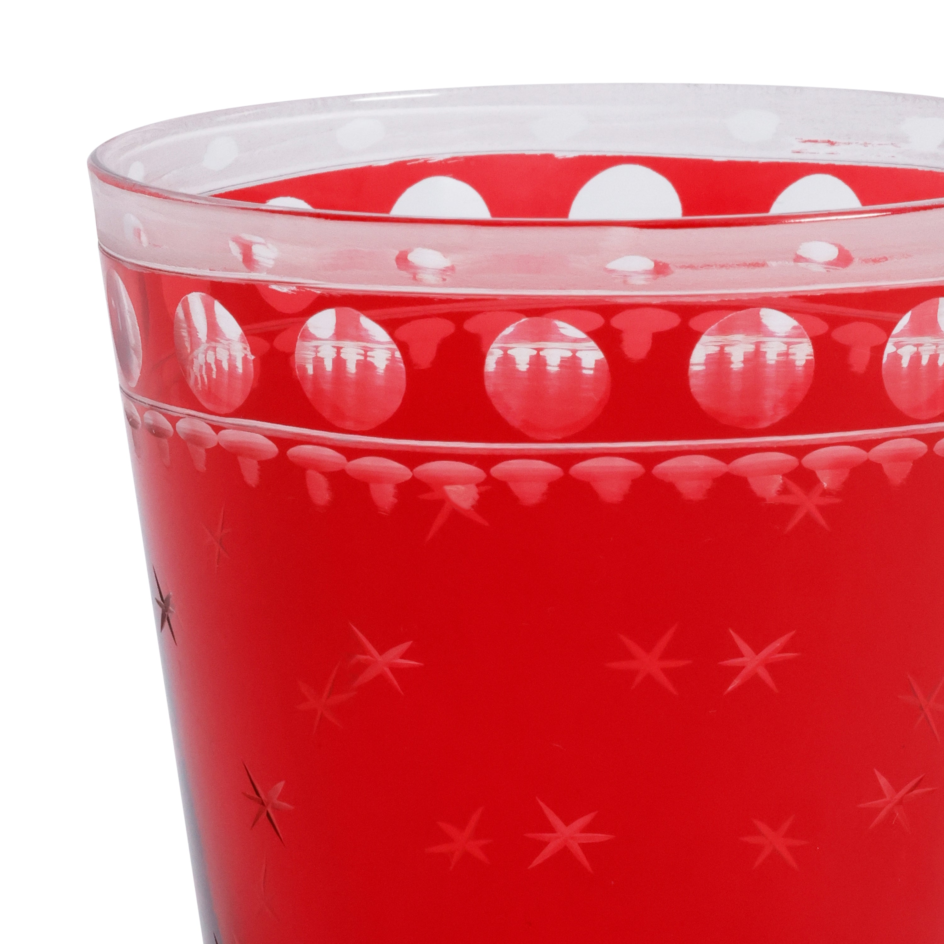 Elevate your holiday tablescape with this elegant set of six red glass candle holder cups, each crafted from premium borosilicate glass. Designed with intricate hand-cut patterns, these festive holders bring a warm, nostalgic charm to any celebration. Their deep red hue and star-inspired detailing reflect candlelight beautifully, creating a soft, ambient glow. Ideal for holiday dinners, mantel displays, or as thoughtful gifts, these versatile holders effortlessly blend classic tradition with elevated craftsmanship. Use standard votives or tealights to set the perfect seasonal mood.