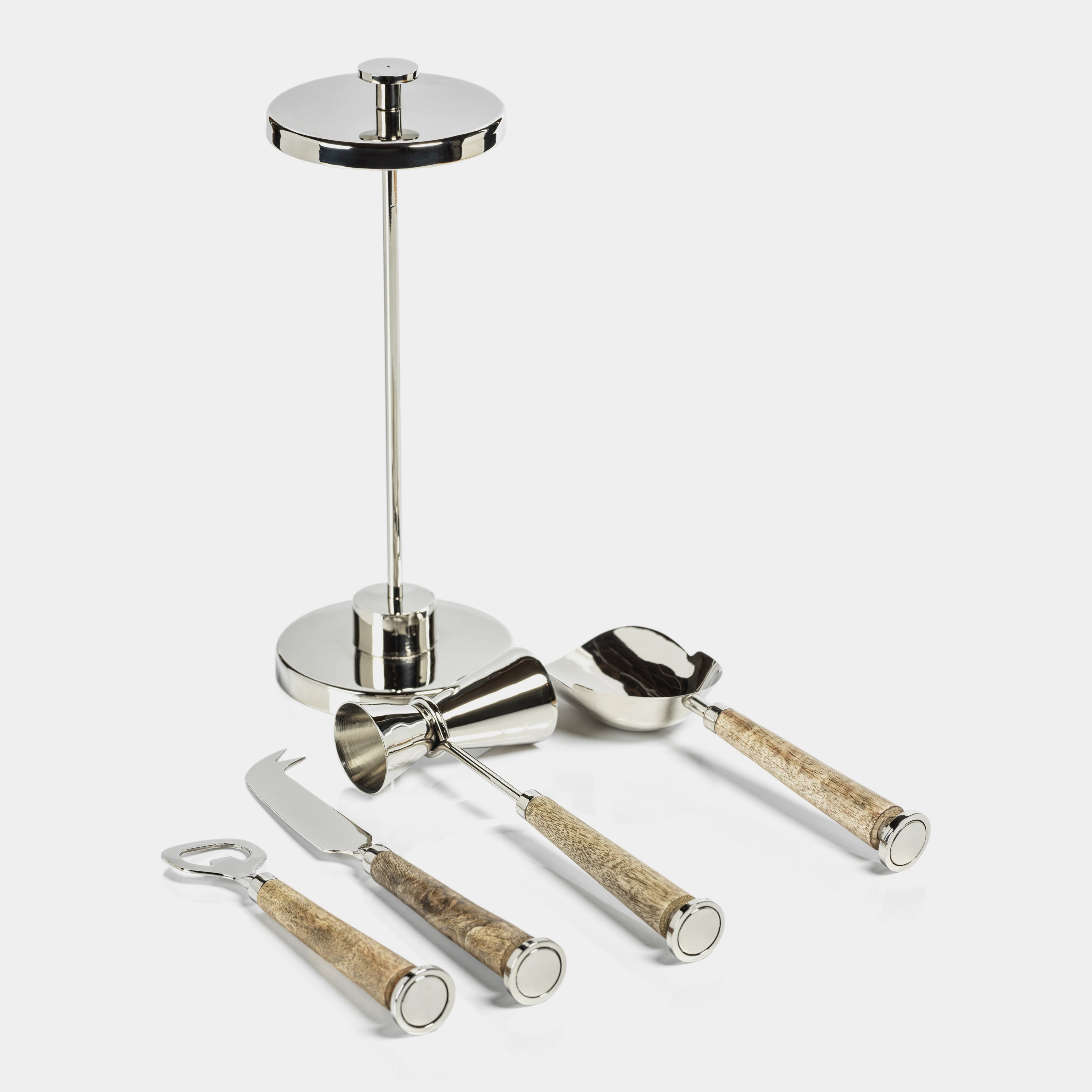 Blending modern design with natural elements, the Gaïo Five Piece Bar Tool Set features polished metal finishes paired with warm wooden handles. This five-piece set brings organic sophistication to your cocktail-making experience, adding a touch of contemporary style to your bar.