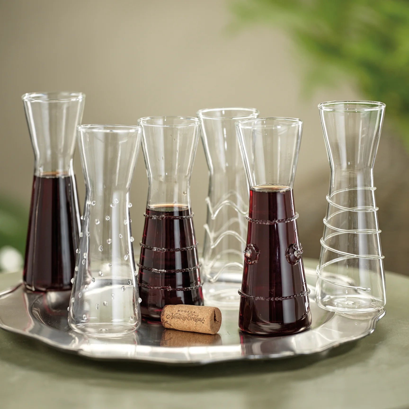 Sleek, sculptural, and effortlessly eclectic. This set of six glass carafes mixes textures and forms—etched lines, bubbled details, and ridged accents—for a dynamic take on tabletop essentials. Perfect for wine, water, or juice, each piece is hand-finished and one of a kind.