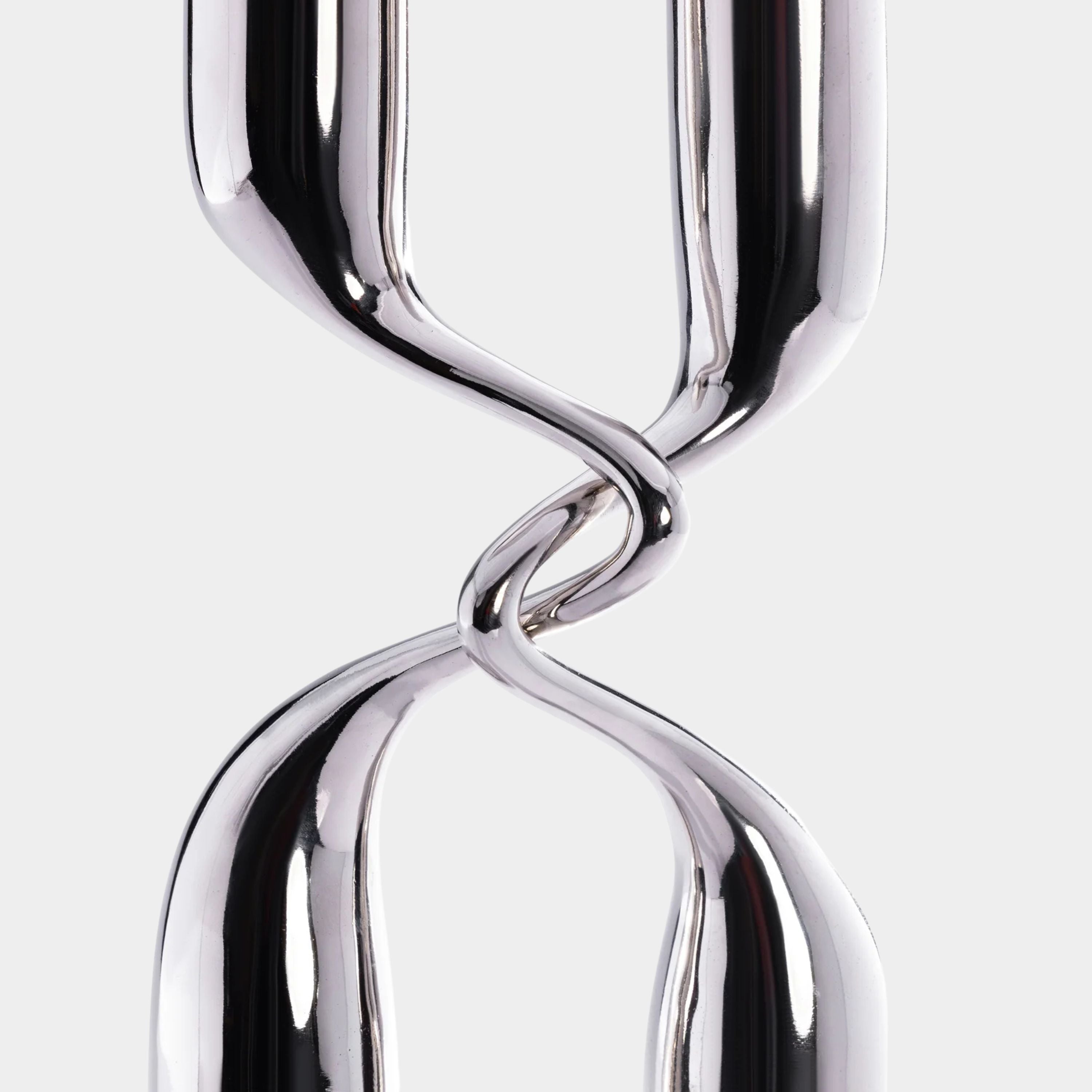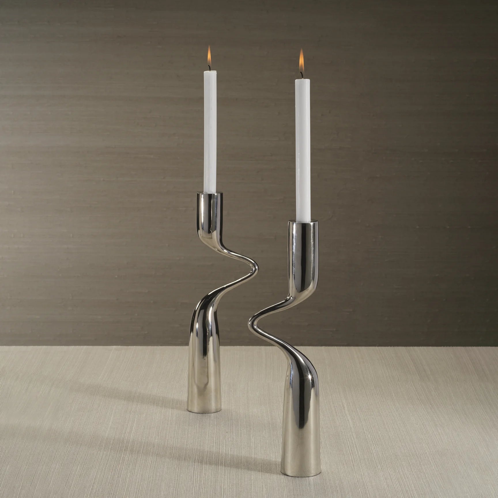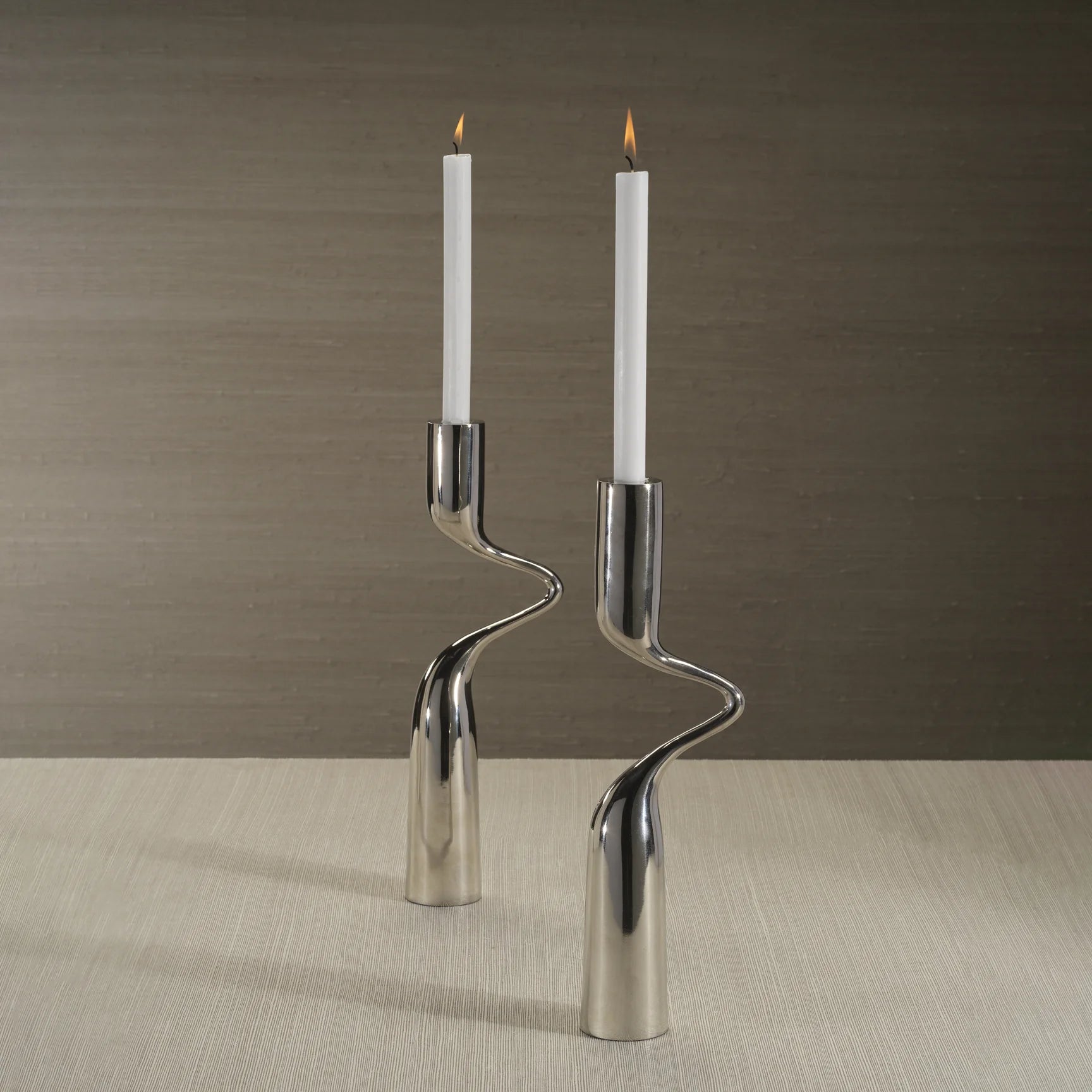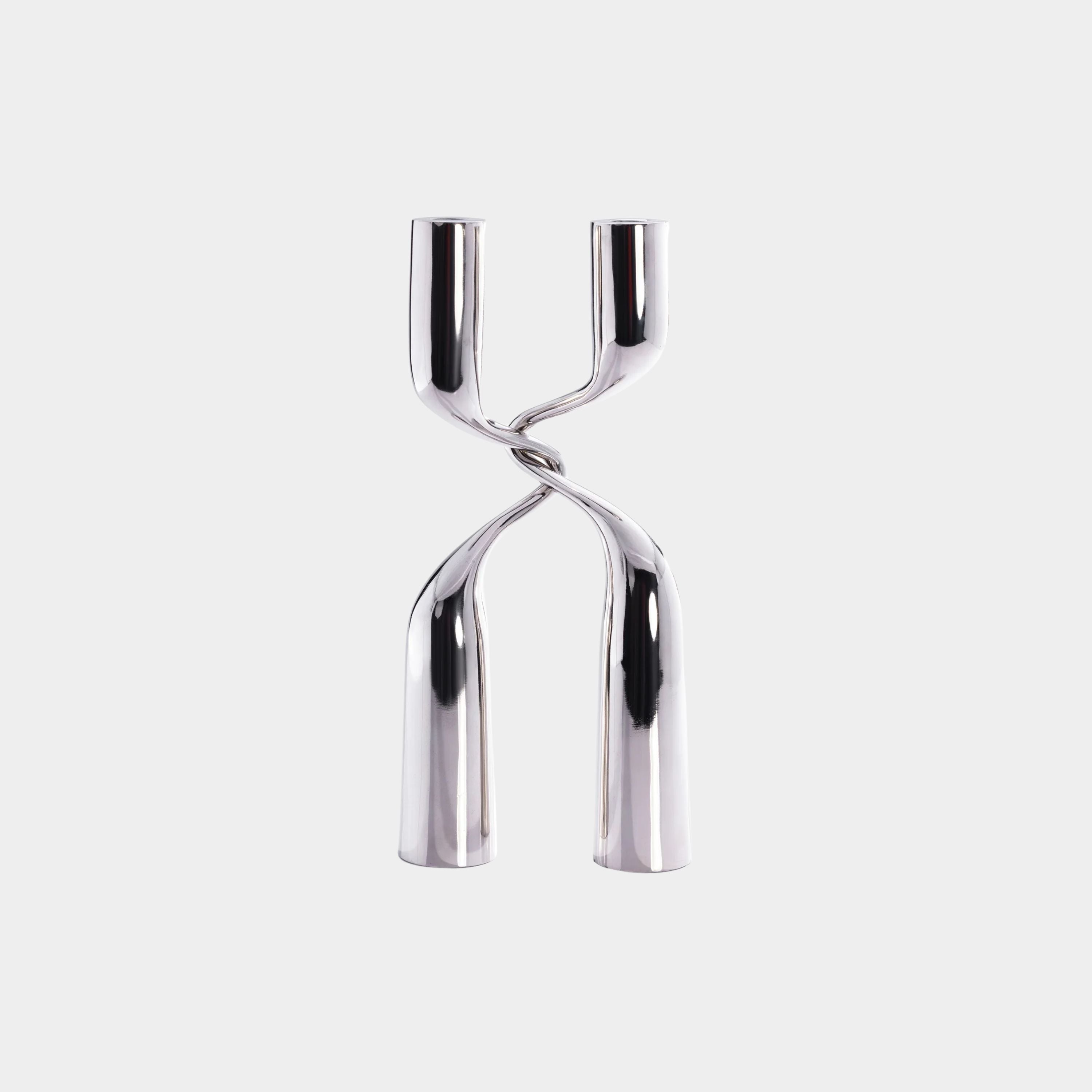 A statement of modern elegance, this 2-piece tapered candle holder set is crafted from aluminum with a polished nickel finish, offering a sleek and sophisticated touch to any space. Designed with a unique intertwined form, these candle holders can be arranged together for a sculptural effect or displayed separately for a refined, minimalist look. The fluid silhouette and lustrous finish make them an ideal accent for contemporary décor, whether placed on a dining table, mantel, or console.