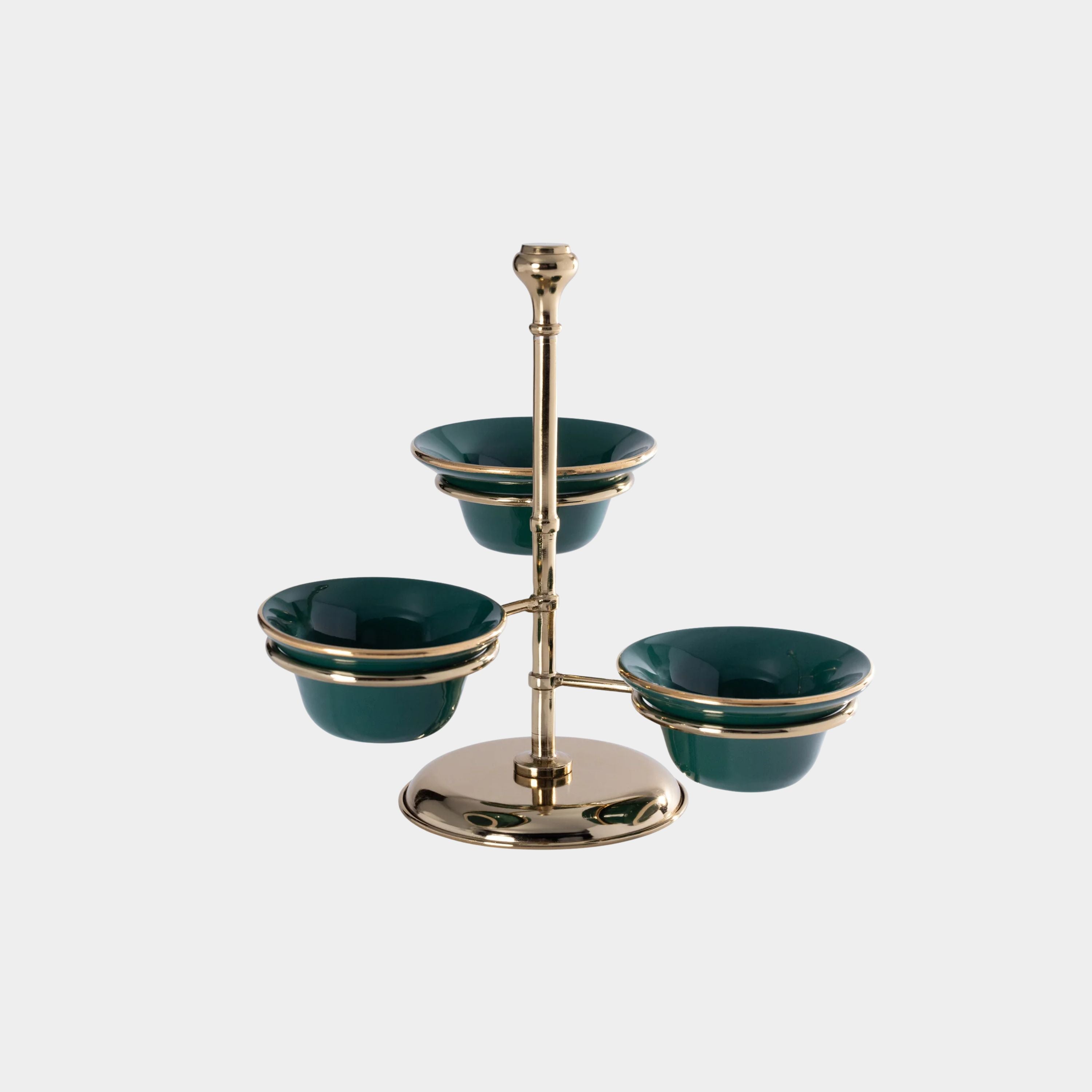 A luxurious addition to any tablescape, the Monte Napoleone 3-Tier Condiment Bowl Set combines practicality with elevated style. Three removable green ceramic bowls sit atop a polished gold stainless steel stand, making serving and refilling effortless. The top of the stand features a convenient knob for easy transport, while gold accents around the rims of the bowls provide an opulent finishing touch.